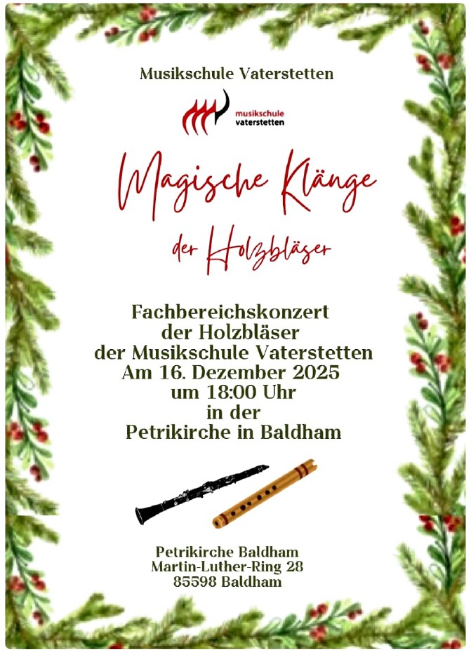 Veranstaltungen 13.Dezember 2025 ab 15:30 Uhr Klingender Adventskranz, Adventskonzert in Baldham 07.Dezember 2025 im katholischen Pfarrsaal Vaterstetten Begabtenförderung – Konzert der Stipendiaten im katholischen Pfarrsaal Vaterstetten 18. Dezember 2025 Magische Klänge der Holzbläser in der Petrikirche Baldham vergangene Veranstaltungen die Musikschule ist dabei 11.-14.07. auf der .... bayrische Landesgartenschau in Kirchheim b. München erfolgreicher AKTIONSTAG Blechbläser und Schlagwerk Besinnliche Abendmusik ein besonderer musikalischer Abend verzaubert Zorneding: Orchesterkonzert der Musikschule Vaterstetten Samstag 22. November 2025 im Pfarrsaal Vaterstetten Kommt vorbei: Tanz auf den Tasten – Fachbereichskonzert